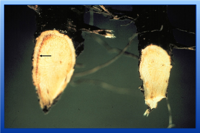 If you suspect Verticillium wilt, be sure to dig up the infected plant and cut through the root system. Look for a thin ring of discoloration near the edge of the root (see arrow in the photo). This dark ring is the infected water conducting tissue. In this photo, compare the discolored vascular tissue of an infected plant (left), with the white root tissue of a healthy plant (right).