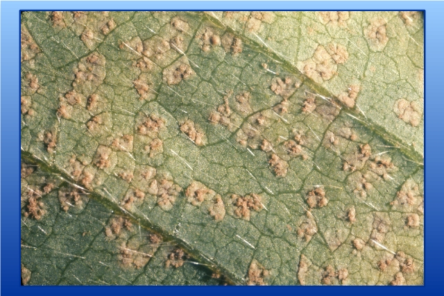 To distinguish soybean rust from other common soybean leaf diseases, check the undersurface of the leaves. The rust pathogen produces masses of tannish, powdery spores that can be easily rubbed off with handkerchief or tissue.