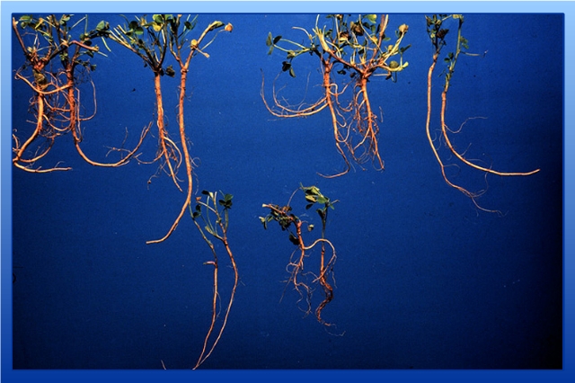 In contrast, Aphanomyces. euteiches is a lateral root nibbler, invading the alfalfa plant’s fibrous root system and leading to extensive root pruning (see plants in photo). While this pruning may cause stunting and lack of vigor in the plant, it rarely causes plant death. Keep in mind that alfalfa varieties differ in the number of lateral roots that they normally produce. Therefore you need to know what a variety’s “normal” root system looks like before you can accurately assess if that root system has been pruned.