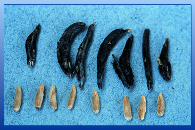 Sclerotia can grow to extraordinary sizes compared to normal kernels as shown in this photo.