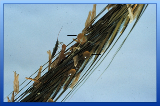 After infection, the ergot fungus produces sweet, sticky, spore-filled masses that attract insects (see arrows). This stage is called the honeydew stage. The sticky spores adhere to the feet of the insects and are transported to healthy heads as the insects move from plant to plant. Eventually the honeydew stage subsides and infected ovaries begin to swell and darken, forming the sclerotia characteristic of the disease.